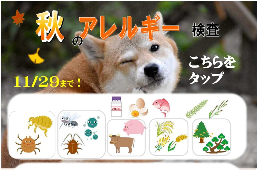 秋限定のお得なアレルギー検査が始まります。 こんな症状ありませんか?*皮膚が痒い *皮膚が赤い *フケが多い *指をよく舐める *お耳が赤い 一つでも当てはまったらアレルギーかもしれません。 血液を採取してアレルギー検査ができます。お...