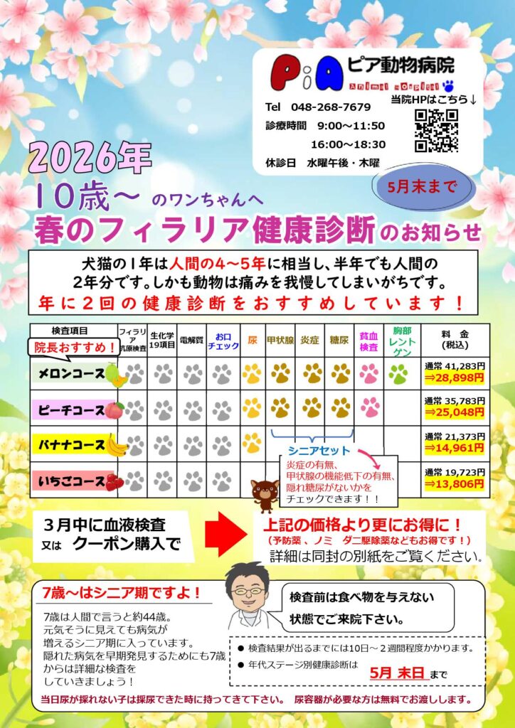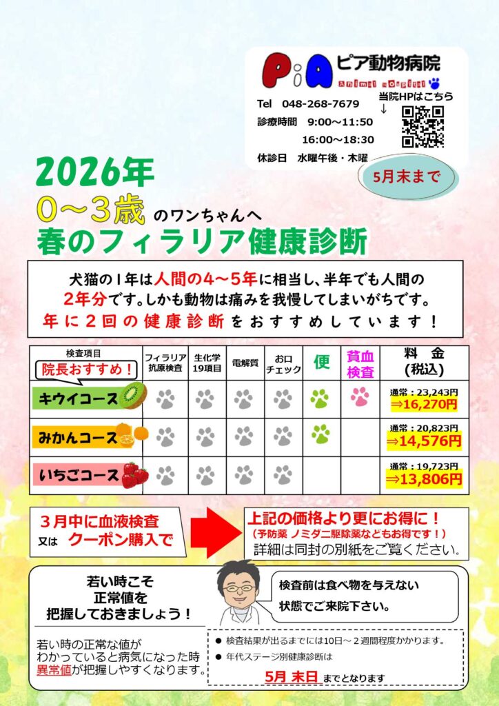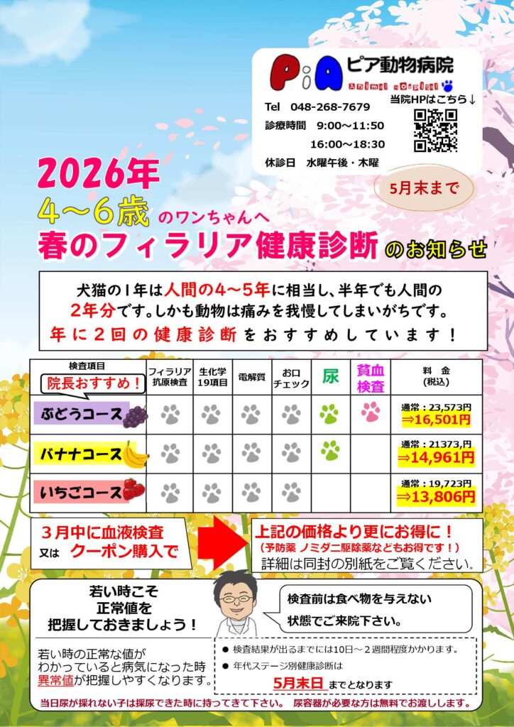 この冬は気温の変化が激しかく、ワンちゃんたちの体にも負担がかかっていることと思います。春のフィラリア健康診断で身体のチェックをしてみませんか?